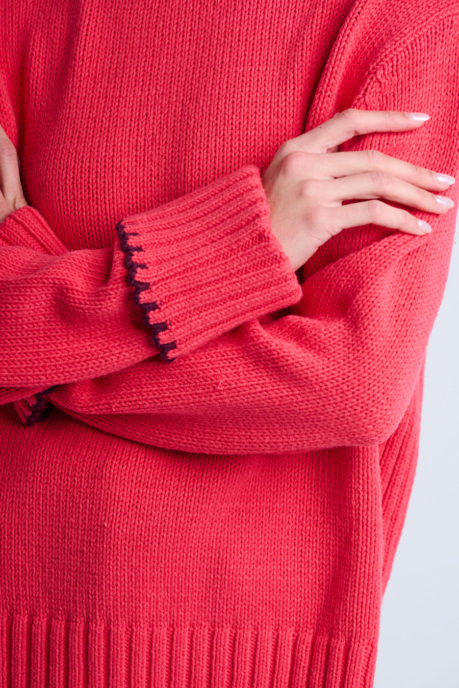 Relaxed and cozy, the Cuffs Up sweater is knit from a Cotton-blend yarn with an oversized silhouette and drop shoulders. Rolled ribbed cuffs with contrast stitching add visual texture and a modern finish. A go-to for easy layering and off-duty days.