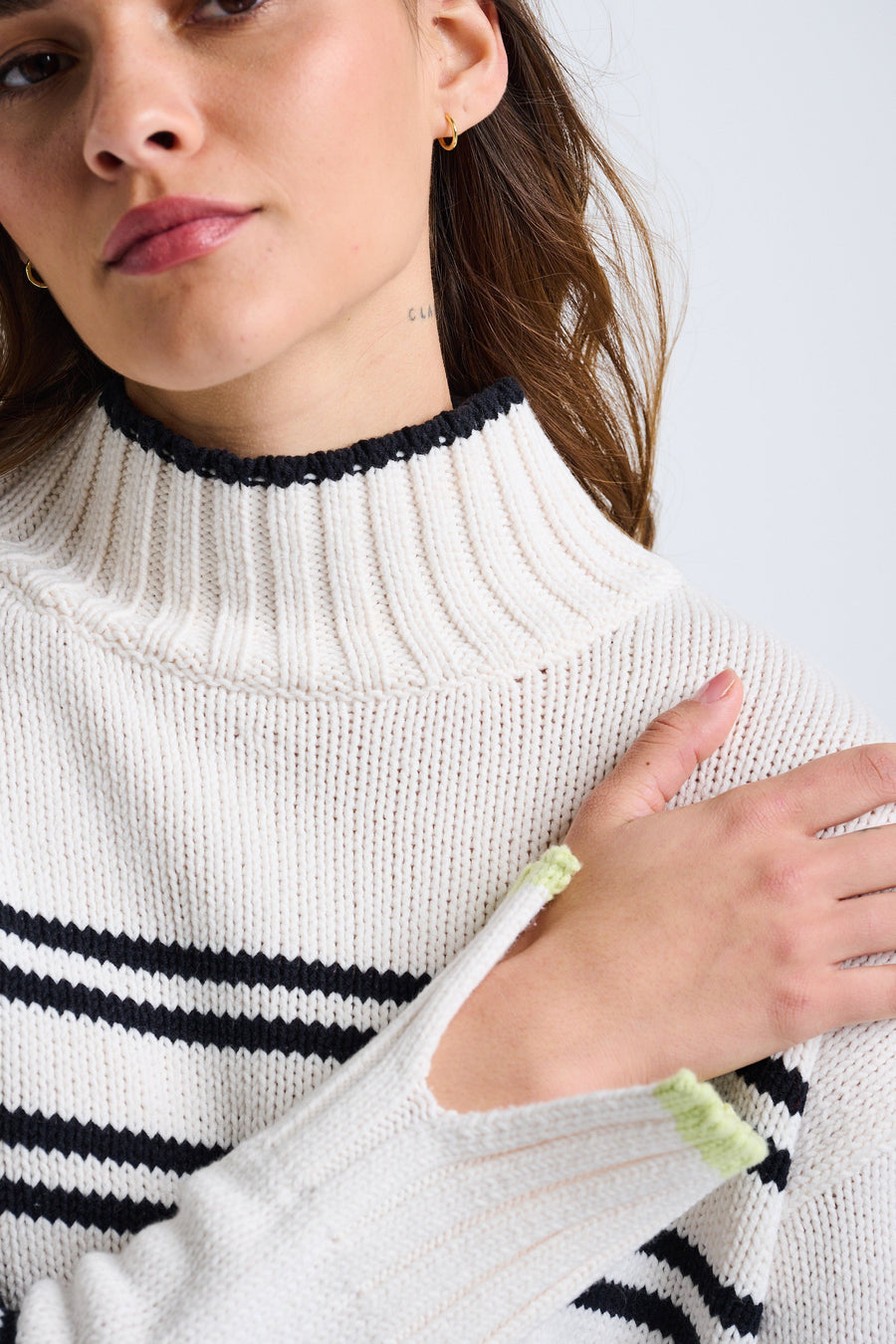 Striking the balance between comfort and polish, Highline is crafted in a Cotton-blend with an oversized fit and graphic stripe detailing. The high rib neck and contrast-tipped cuffs elevate the silhouette, while a split cuff offers ease and movement. A modern layering piece with quiet impact.