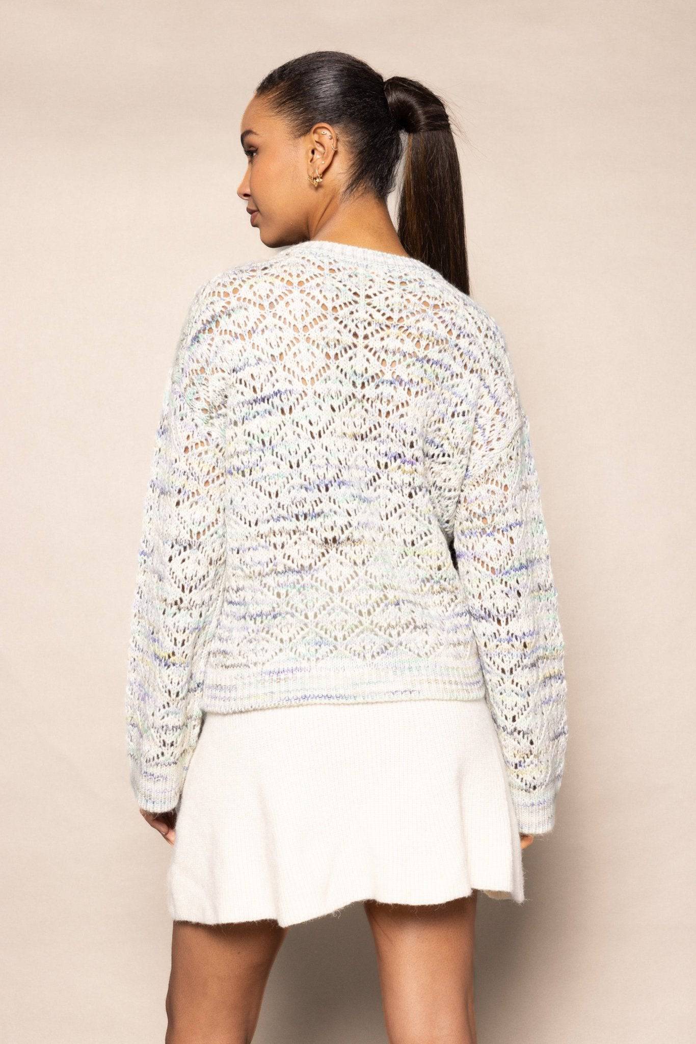 The perfect oversized style, consider sizing down for a true fit. This cozy open-knit sweater features a beautiful blend of cool hues in natural, blue, and green.